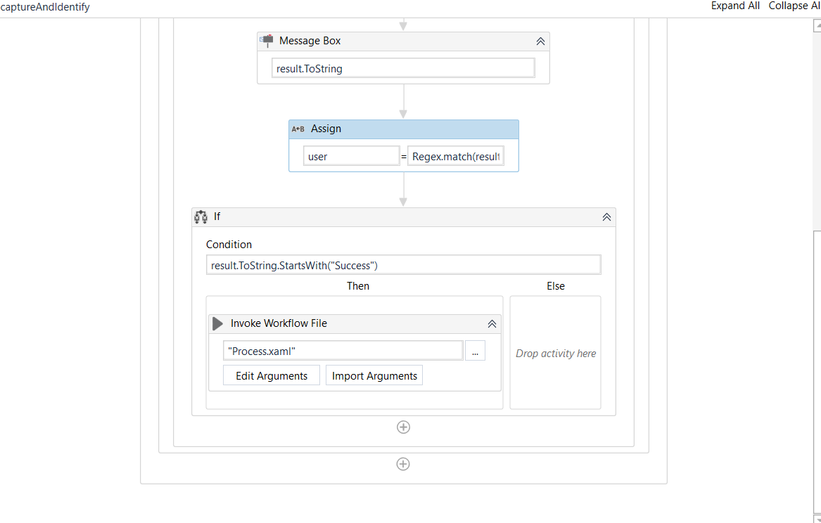 After completing the training, the bot will be closed automatically. Now again run the main .xaml file and then click on the execute button. Then click on the space button once you appear on the screen. It will take a few minutes to detect the person. Close the window, by default it shows a message “This is where your custom process should be. Edit the Process.xaml workflow in order to customize it.”. Now go to process file to get rid of this message.