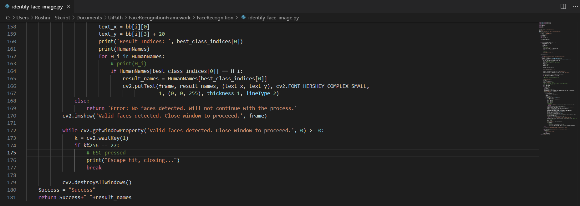 Go to the framework folder, then go to the face recognition folder. Inside it, open the identify_face_image python file. Here is where we need to make some changes. The invoke python method returns an object, but we need the name in the form of a string. First, change the type argument to object to get python object property and then set result variable to object.