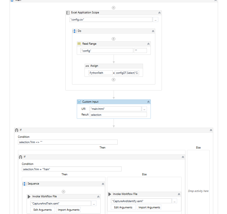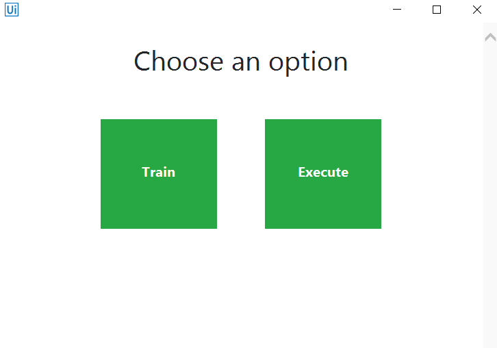 The Main.xaml file will look like the above image. In the config file, specify the file path where you have installed the python path. Now run the Main. XAML file, a dialog box pops up where it shows two buttons train and execute.