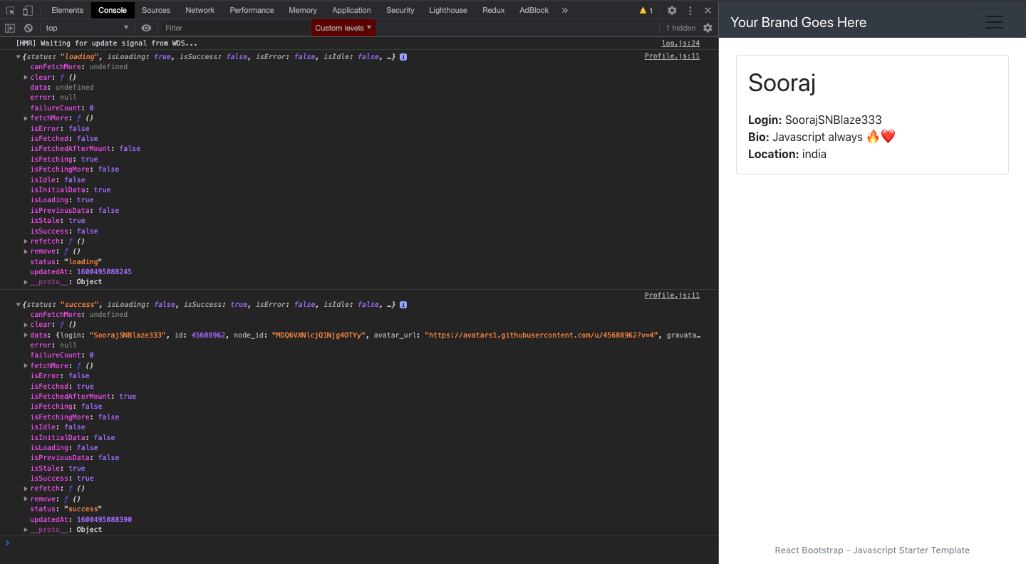- error(any) - This object will have the error message in its message key. If status is ‘success’ or ‘loading’, error will be null.