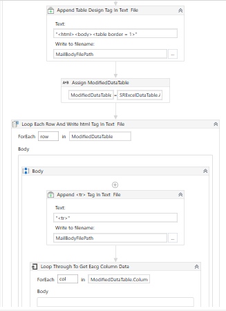 By using For Each activity to read each row of the data table and write those details in HTML format to create an HTML template for the email body.
