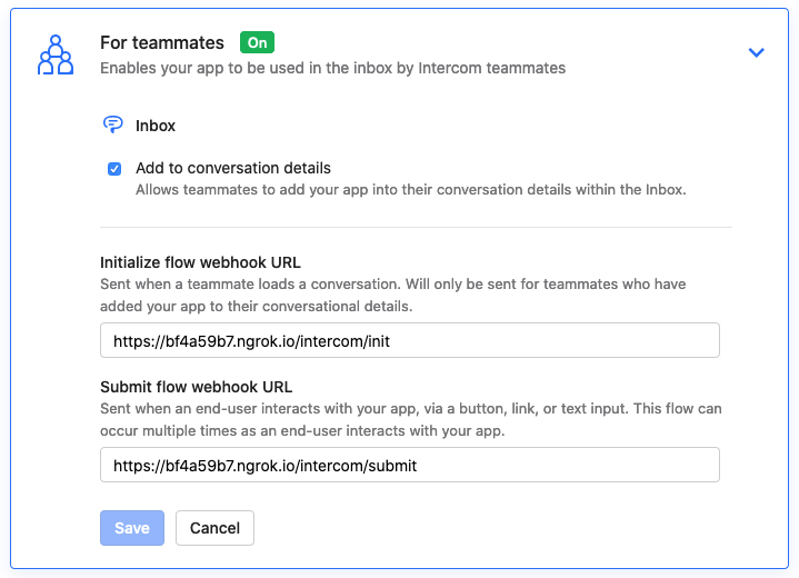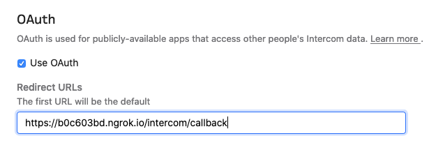 Enable OAuth for your Intercom App and let’s configure a callback url. This will be the url to which Intercom will ping us with the code param. Use ngrok to expose your local port to receive requests from Intercom.