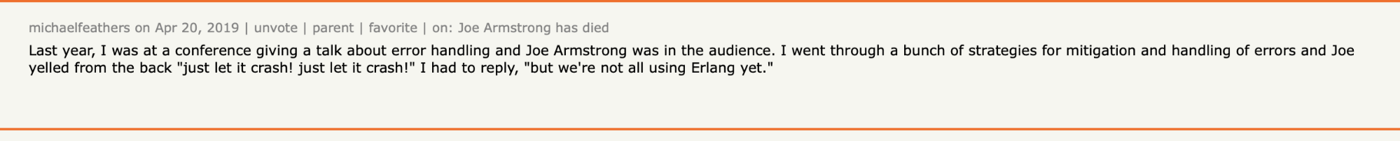 Fault Tolerance Joe Armstrong, (late) creator of Erlang, said the infamous line, “Let it crash”. He designed the fault tolerant language not with the goal of preventing errors from happening, but to build structures that handle error scenarios.