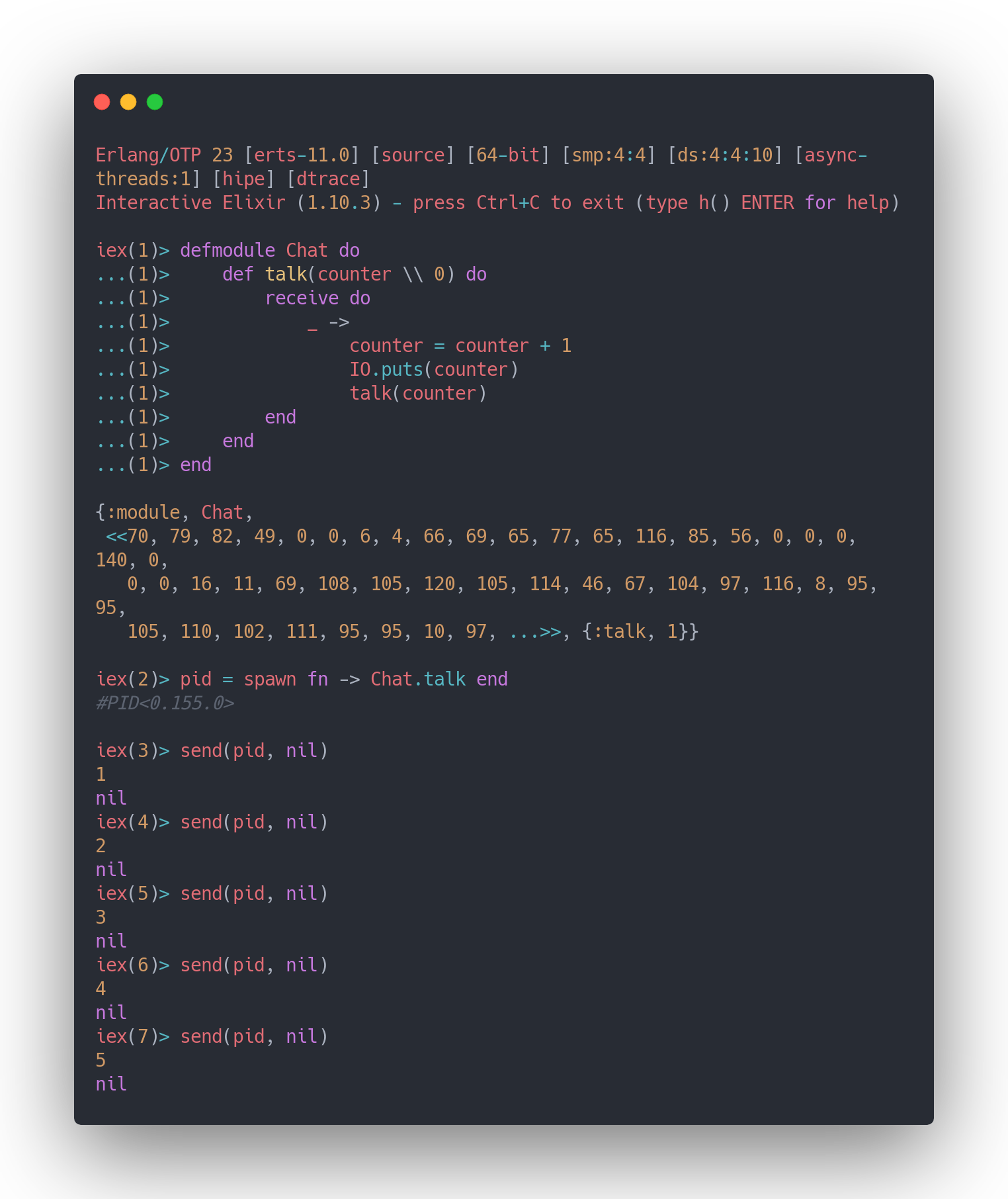 You can see here that each process also has its own internal state. Everytime we send a message to the process, it does not restart the function with default values, rather it is able to retain information of the state of the running process. Inherently each actor is able to access it’s own set of memory, and keep track of it.