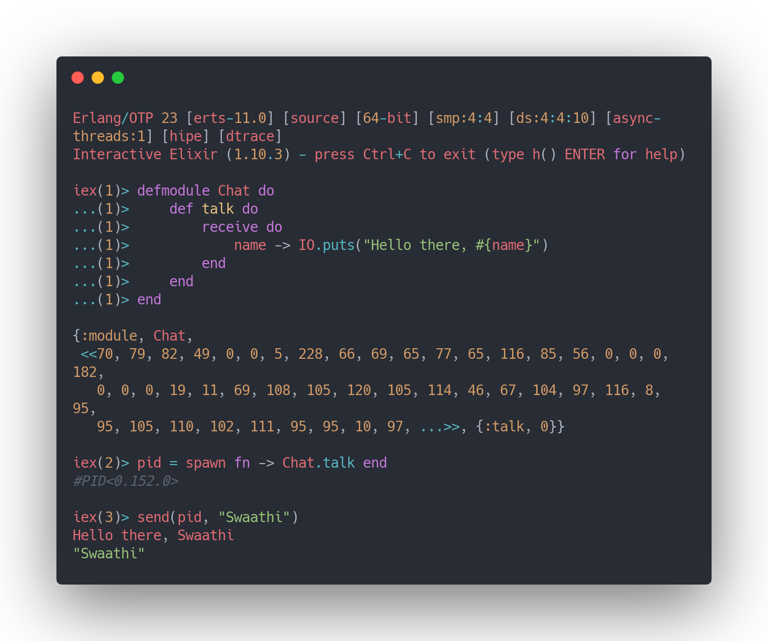 Erlang threads also have a PID attached to them. Using this PID, you can extract information about the memory it occupies, functions it’s running and much more. Using the PID, you can also send messages to processes and communicate.