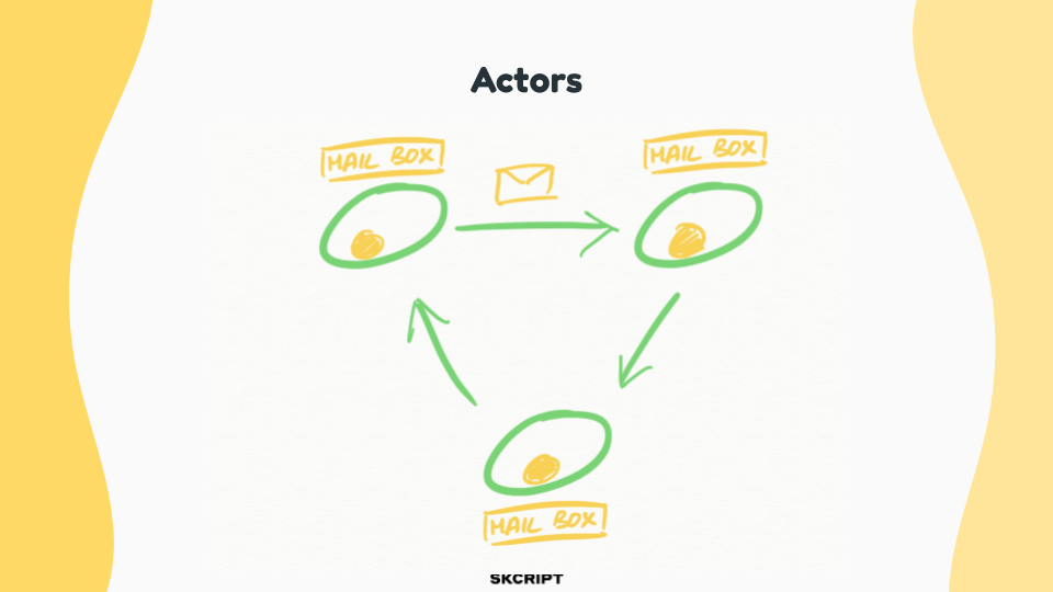 This is the model used by Erlang and Rust to achieve concurrency. It depends on isolating processes as much as possible and reducing communication between them to message passing. Each process is known as an actor. Actors communicate with each other by sending messages. Messages can be sent at any time and are non-blocking. These messages are then stored in the receiving actors mailbox. In order to read messages, actors have to perform a blocking read action.