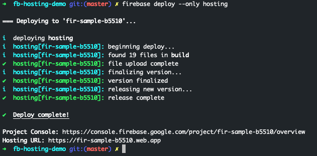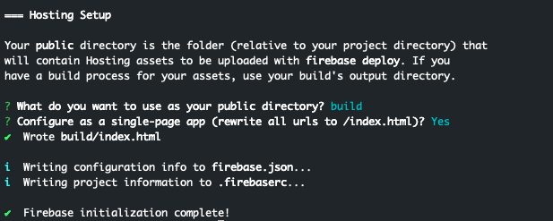 Once it’s complete, we can find the build folder inside our app’s root folder. This means the app is ready to be pushed to firebase hosting. Just run the following command in your terminal to deploy to firebase hosting.