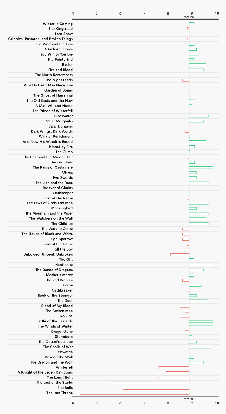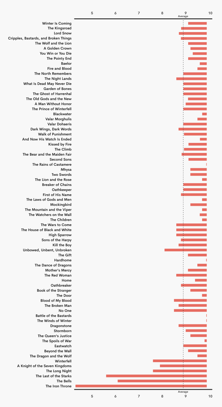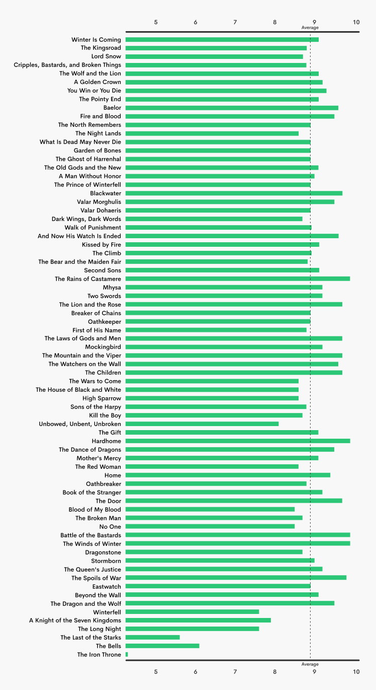 Where as here is a chart comparing the highest rated episodes in the whole series, namely “The Rains Of Castamere (S3E9)” and “Hardhome (S5E8)” with individual episode ratings.