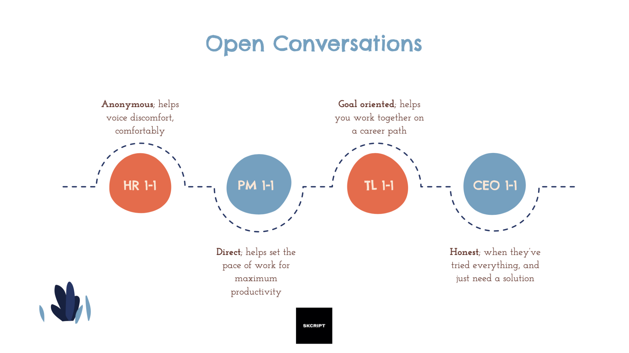 The best relationships are those where you can wear your heart on your sleeve without worrying about the repercussions. We encourage everyone to speak openly by setting up a platform that doesn’t judge. We do this by having different kinds of 1-1s. You have your standard HR 1-1 where you can voice out discomfort, comfortably and anonymously. There are PM 1-1s to help set a pace of work that helps you achieve maximum productivity on your own terms. There are TL 1-1s to help set you up for success by discussing career path and professional goals either at Skcript, or elsewhere. And finally when nothing is going right and you need a solution, talk to the CEO directly!