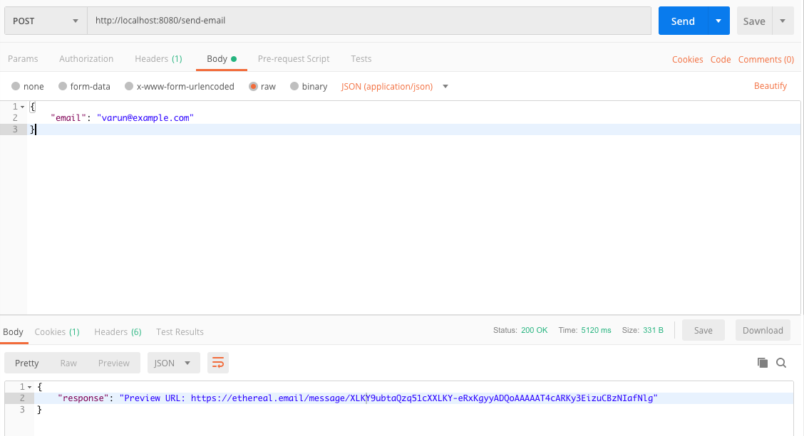 Now, curl -X POST http://localhost:8080/send-email -d "email=foo@gmail.com" will respond with a success response, and the email preview will be opened in your browser.