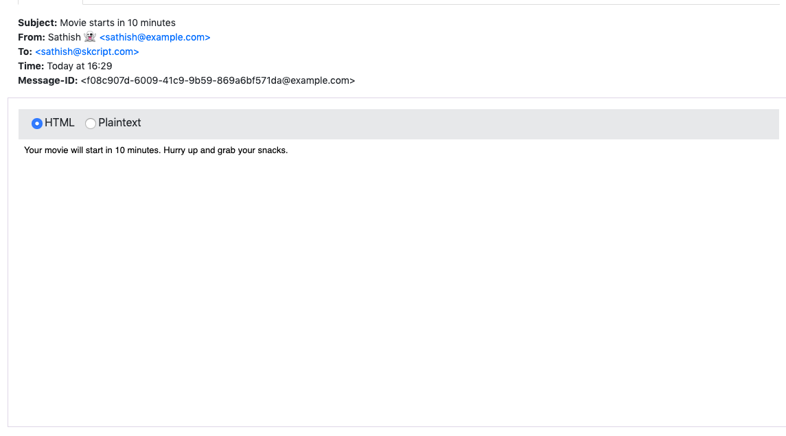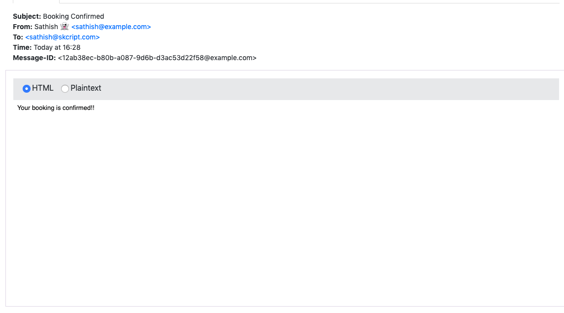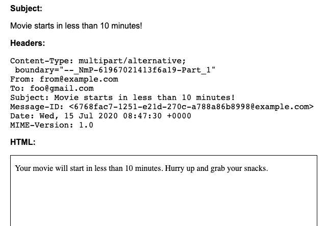 This example project will send an email after a person books a movie ticket. The first email will be the confirmation of the booking which will be sent out as soon as the movie is booked. The second email will be a reminder email that will be sent 10 minutes before the movie timing by a job scheduled using Bree.
