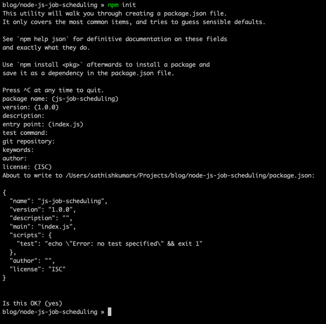 First things first, let’s create a directory for your project. I have assumed the project name as node-js-job-scheduling. Using mkdir node-js-job-scheduling , create your directory.