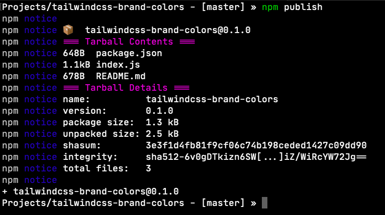 You can now see your package in your account on npmjs account. Check out the package we published now here: https://www.npmjs.com/package/tailwindcss-brand-colors
