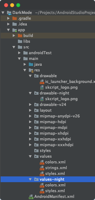 Note: If you want to replace the color in the app, you need to create a custom values directory, called values-night, and for image resources as well we will create drawable-night.