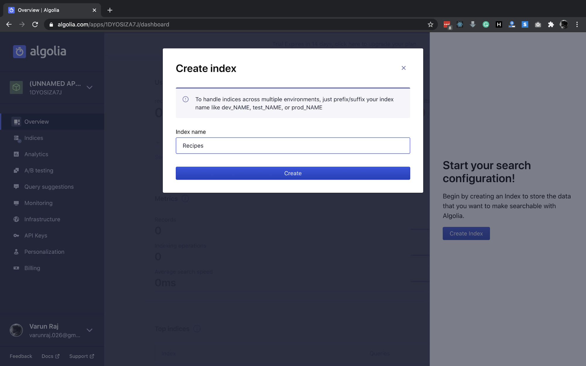 Similar to Firestore collections Algolia has an “Index” - the aggregation of data under a common umbrella. Create your index to store the data.