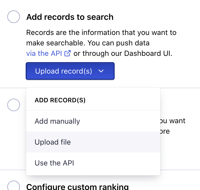 After creating an account, add data to the index. Among the 3 different options for adding the data, we’ll be using the API for importing data with help from the firebase cloud functions.