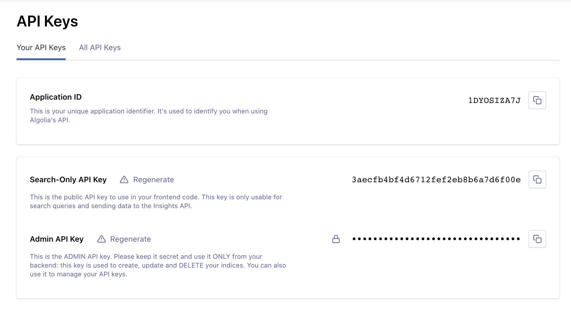 To get the API keys from Algolia, go API Keys section in Algolia dashboard and copy your Application ID and the Admin API Key