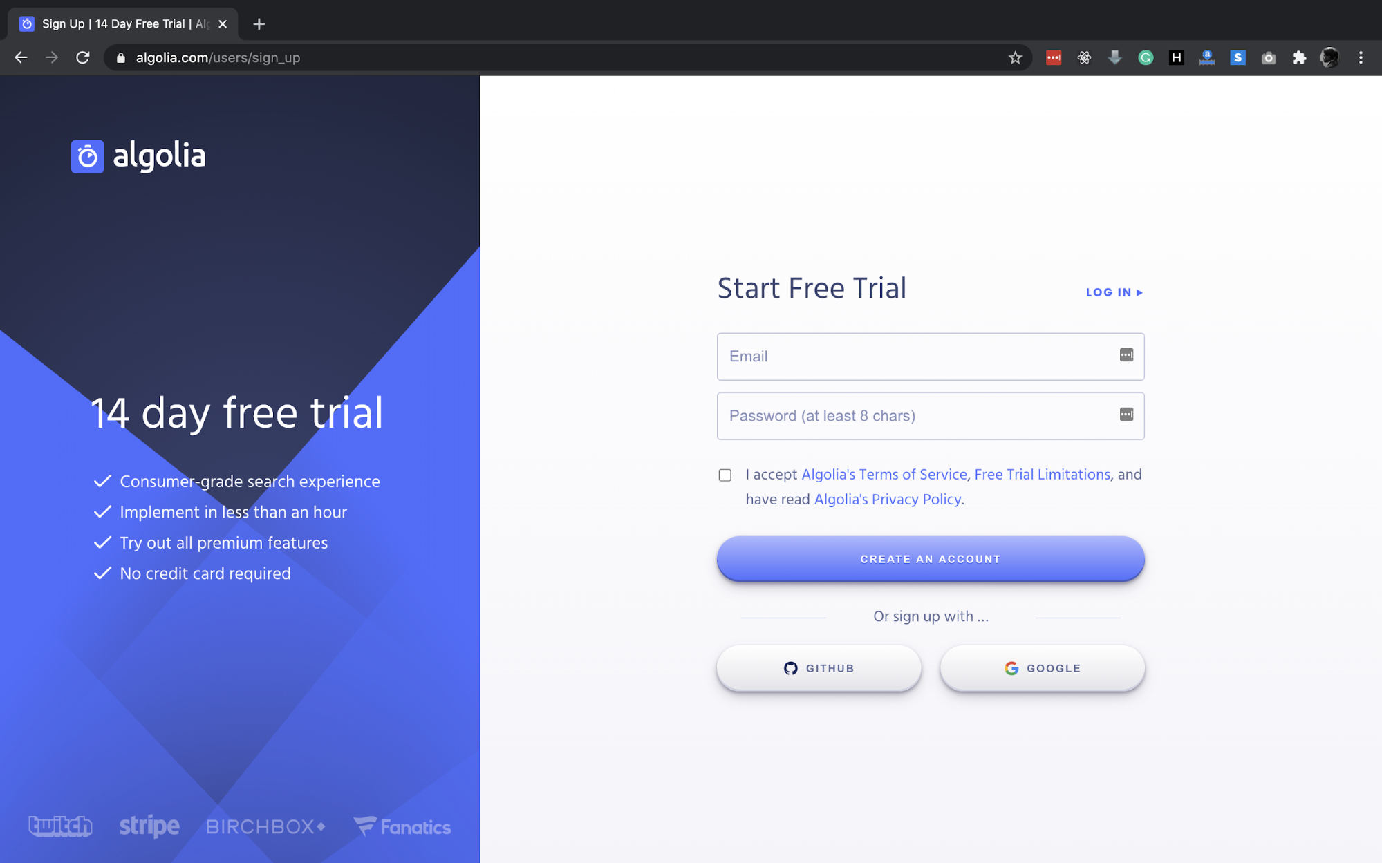 As the first step, you can navigate to Algolia and register your account by either signing up with Google or Github or just with email.