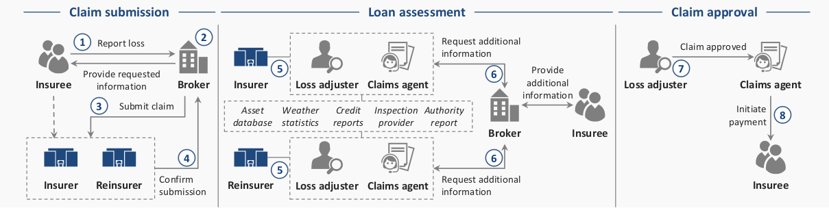An Insuree may report a loss or a claim to a broker, and with the required information submits it to the Insuring authorities, namely the Insurer and if applicable, the Reinsurer . The claim submission is confirmed via a receipt to the Insuree. The Claims Agent may request for additional information for the claim, via an external source. After these steps, if all the conditions are satisfied, the claim is approved, and the payment is initiated via the Insurer’s Claim Agent.