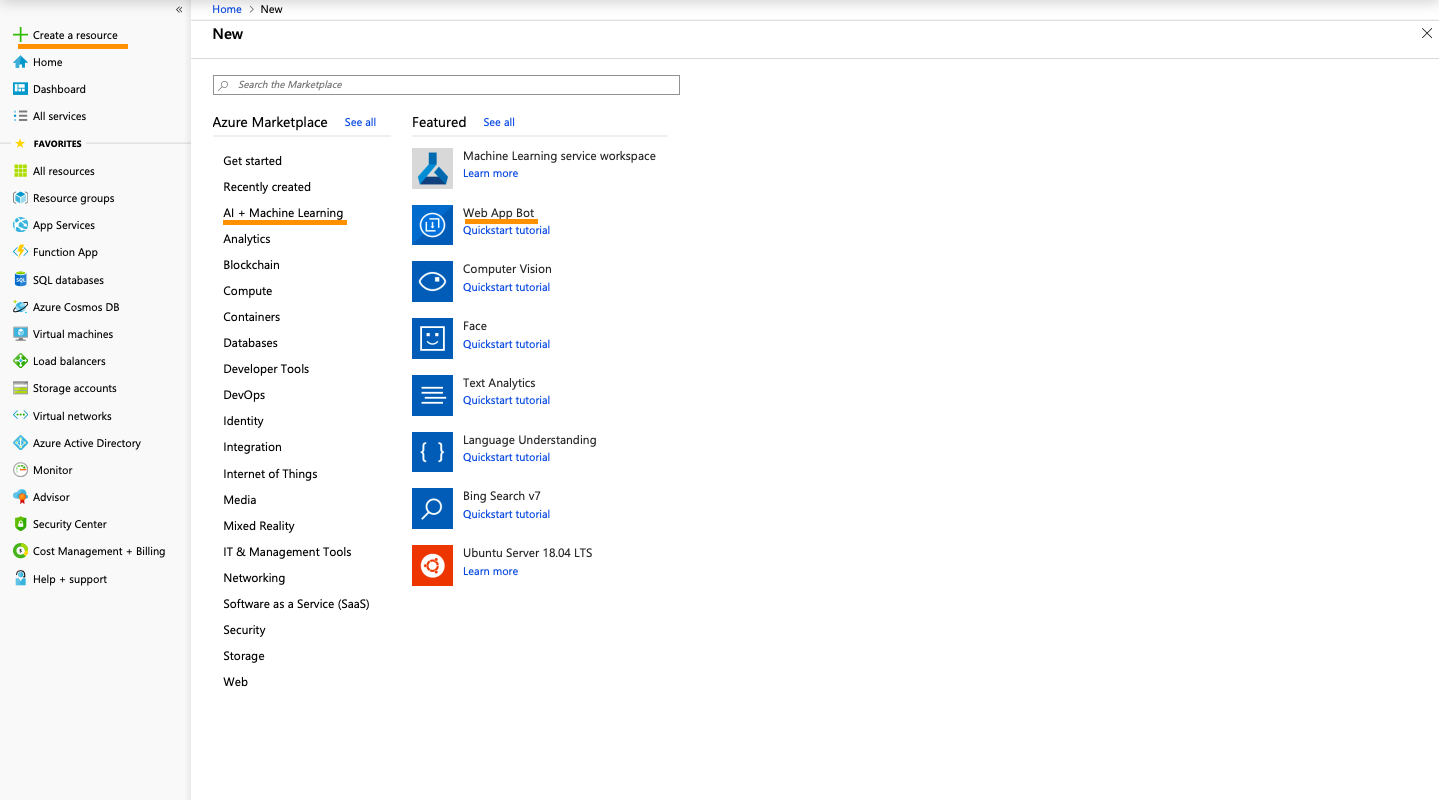 Click Create new resource link on the upper left-hand corner of the Azure portal, then select AI + Machine Learning > Web App bot.