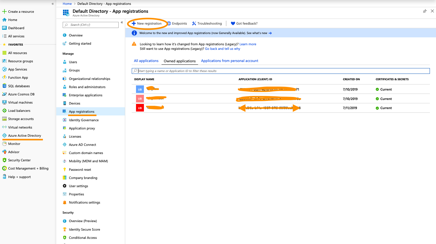 To create an app, go to Azure Active Directory -> App registrations -> New Registration.