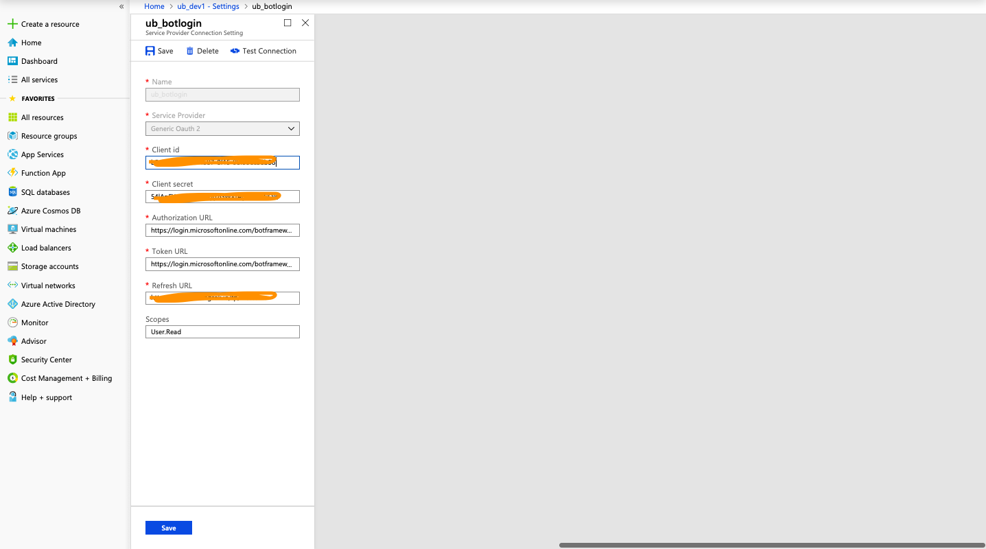 Fill up the form that opens up. In the Microsoft App ID and password section, give the app id and client secret as the password.