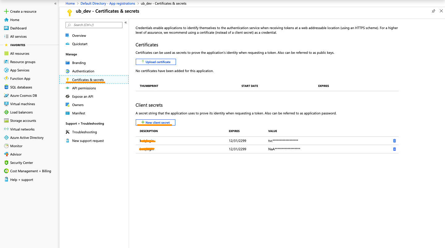 Go to Certificated & secrets -> New Client secret and give a name and set expires to Never and click on Add.