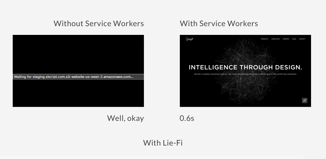 Lie-fi means that the connection is very unstable, but the browser still thinks that a perfect connection has been established. As you can see, we now have a good offline experience and a custom screen will be shown even when no internet is available. And just like that, our site is available offline first and is available even on flaky connections.