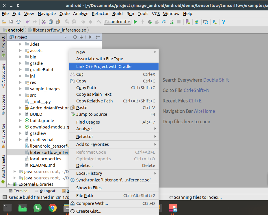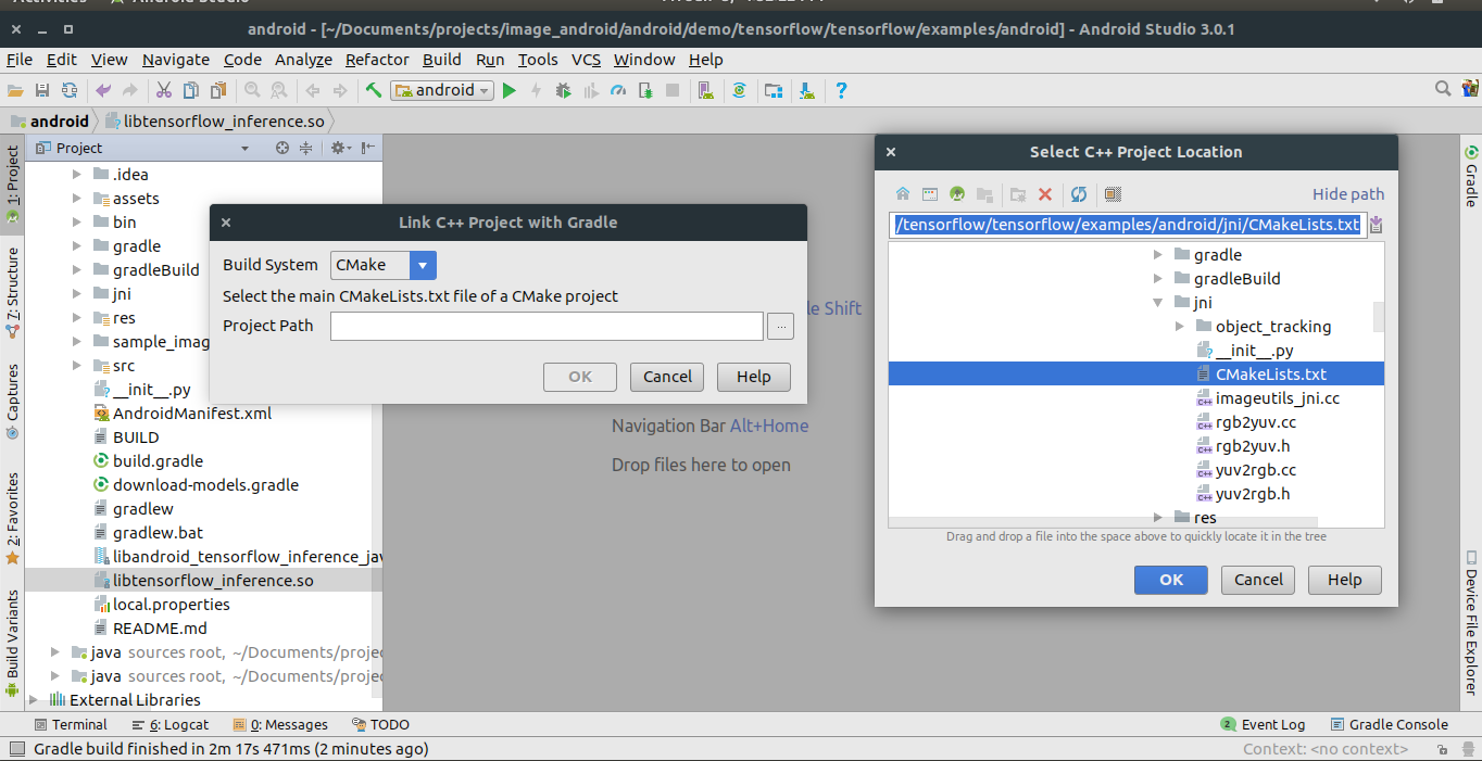 Click the libtensorflow_inference.so and choose Link C++ Project with Gradle . Then a CMake dialog box opens give the path of the CMake.txt .Refer the below image