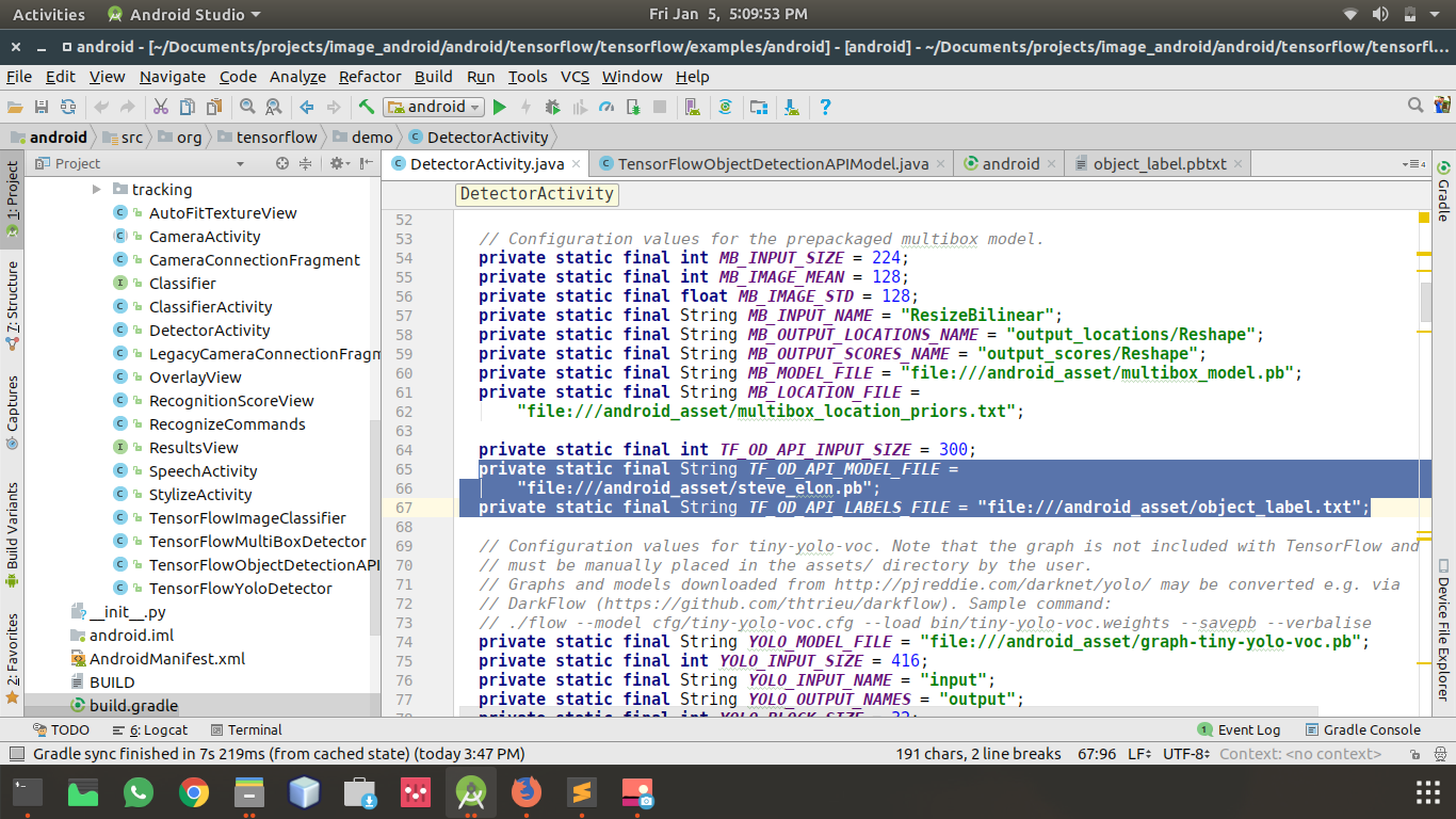 tensorflow/tensorflow/example/androidand open it.You have the pre-built Tensorflow demo modues applied in the android application .Create an assets folder under your app project and move your steve_elon.pb(model file) and object_label.txt (label file) to it.