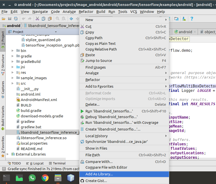 Click the libandroid_tensorflow_inference_java.jar and choose “Add As Library”