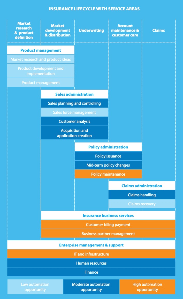 The image below shows the automation potential within the different service areas (administration, service, and support work) across the entire insurance life-cycle.