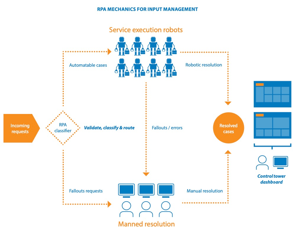 RPA is well adapted for processing contacts from customers via paper mail, email, or input from other channels. As an initial step, non-electronic input gets digitized. Following this, RPA works with optical character recognition (OCR) and intelligent character recognition (ICR) software to recognize the subject of the request and intensify the correspondence with meta-data, which includes all the relevant extracted data about the document.