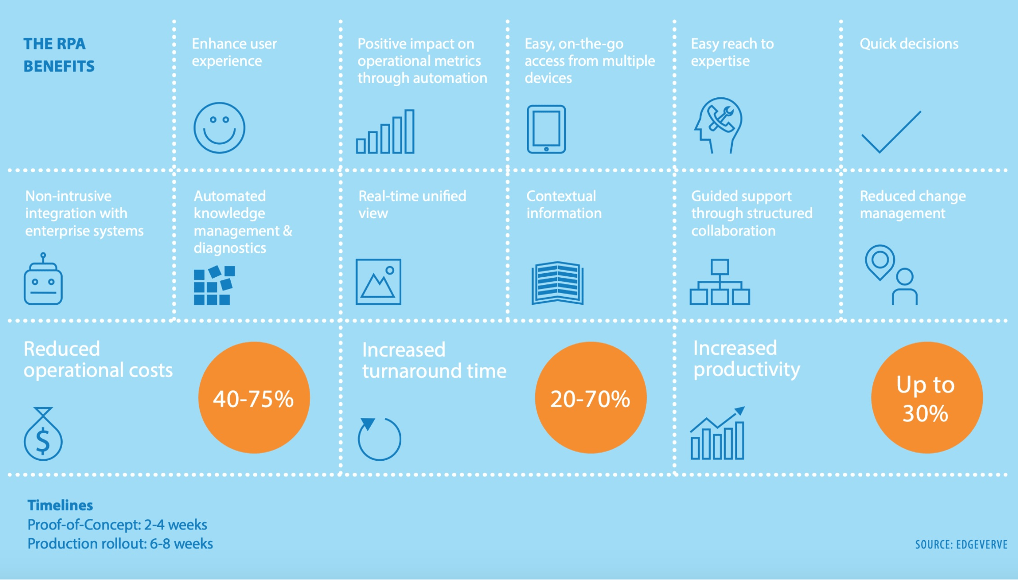 Factors that cause the RPA attractive include fast implementation. As a result, a quick return on investment. The image below lists typical results in reduced operational costs, increased turn-around time to fulfill a request, and increased productivity.