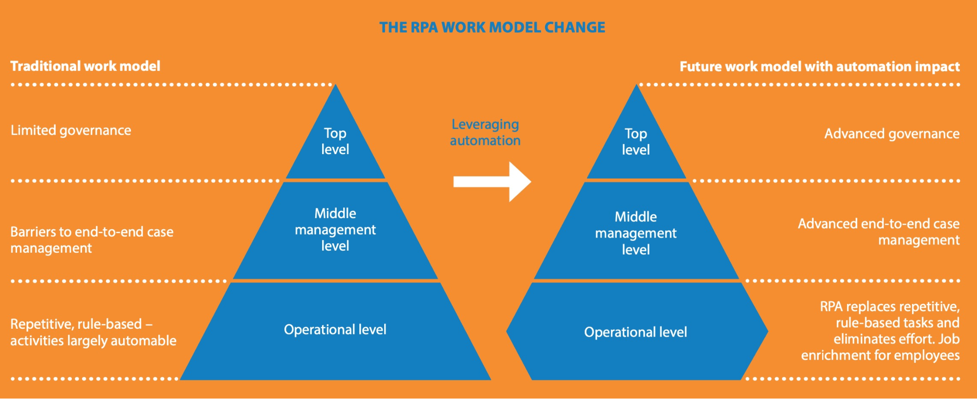 From a strategic human resources perspective, RPA has the potential to reshape the workforce from a “pyramid” to a “pentagon” model (see diagram below). As RPA covers repetitive, rule-based tasks, it allows employees (especially on the operational level) to target more difficult, higher-value activities like monitoring, quality control, and problem-solving – and thus amplifying the workforce potential of each individual.