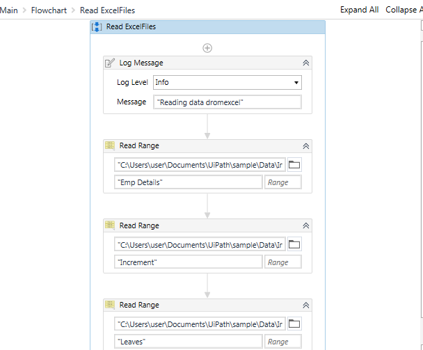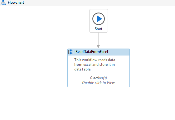 Drag one sequence and attach it with flowchart. Inside this sequence, we will read data from the excel file and store it in DataTable.
