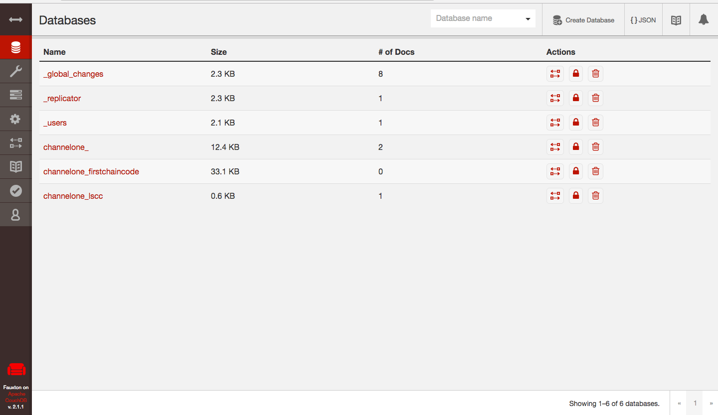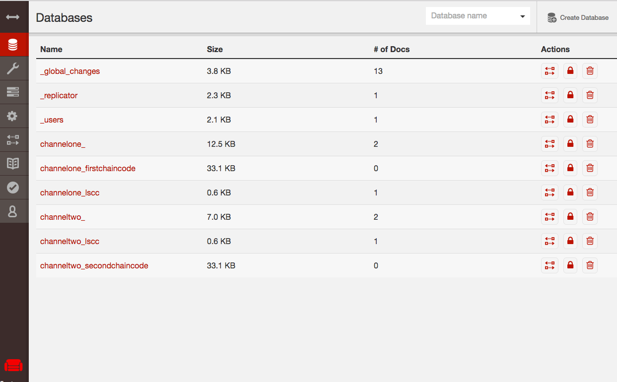 With this part our entire network setup is over and we’re good to test the network. If we look at the couchdb admin, it’ll have the database for the corresponding channels and the chaincodes.