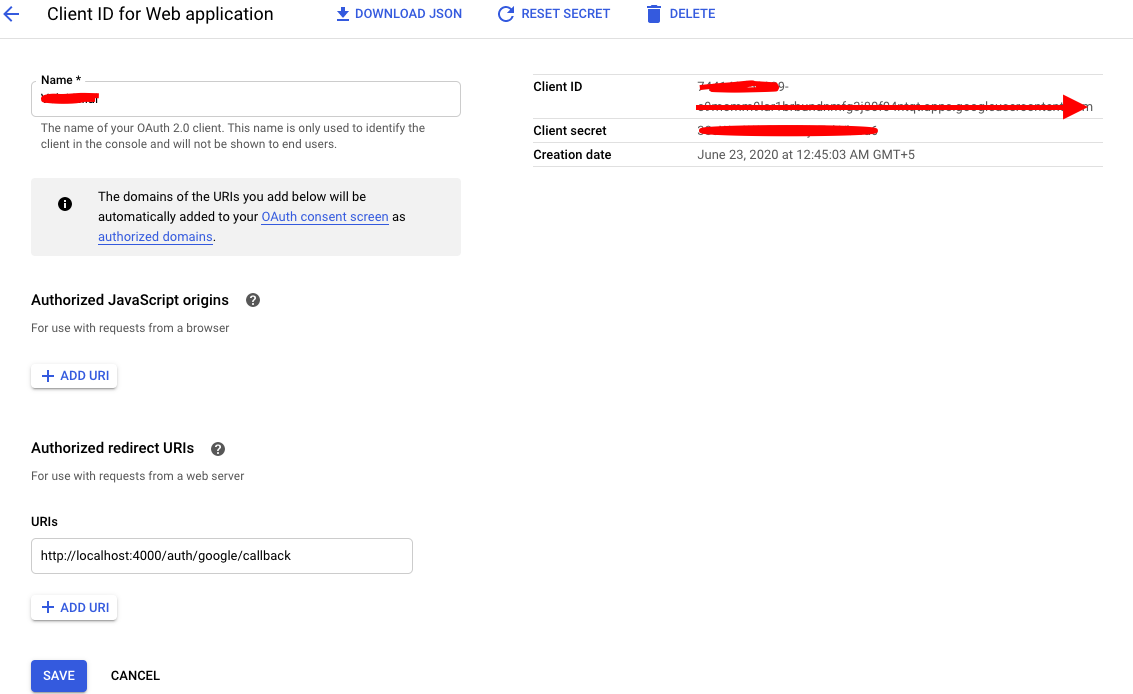 Create a Google project by following the steps given here. The Google app will generate the client_id and client_secret that we need to configure in our app. In the Google app configurations, set the redirect_uri as “http://localhost:4000/auth/google/callback/”.