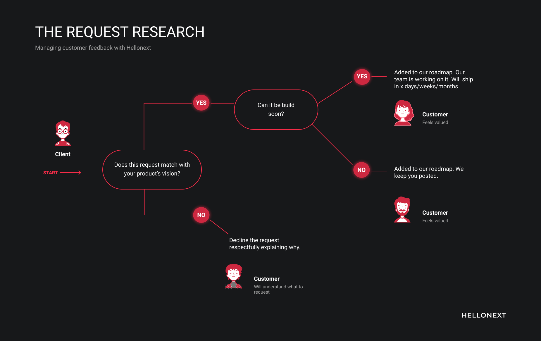 Always be straightforward and transparent on your decisions. When your customer shares a suggestion, you should explain to them does this idea fits on the vision of the product? It’s the best thing of being straightforward with an answer ‘Yes’ or a ‘No’. Instead, killing to leave the user in the middle of it.