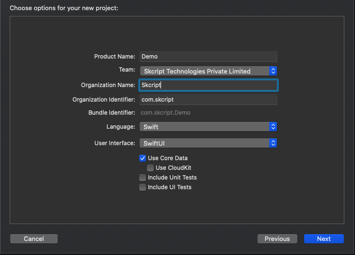 Let’s start by creating a single view iOS application with user interface as SwiftUI and “use core data” module selected.