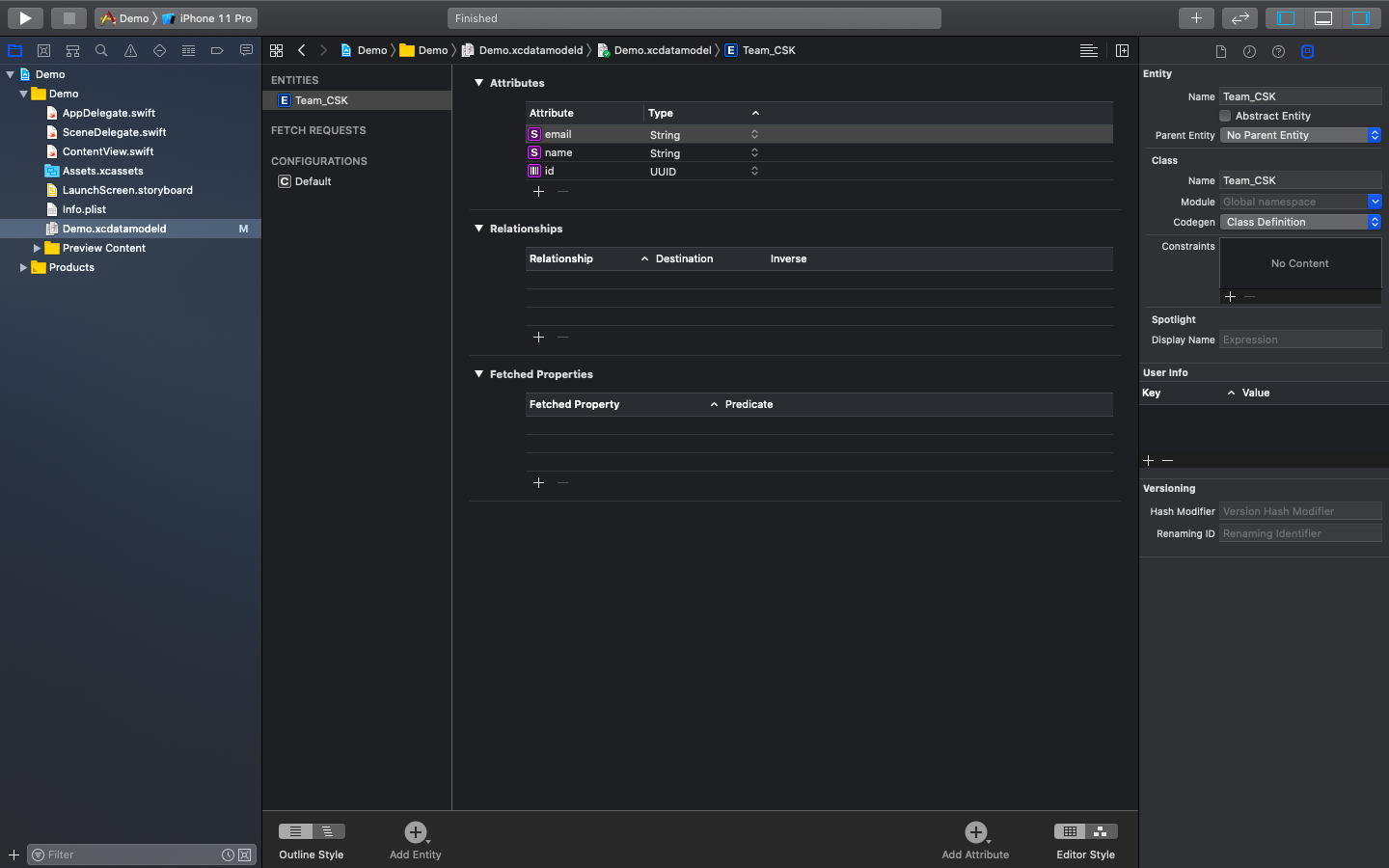 - You will find a new file called Demo.xcdatamodeld, where this is our data model.