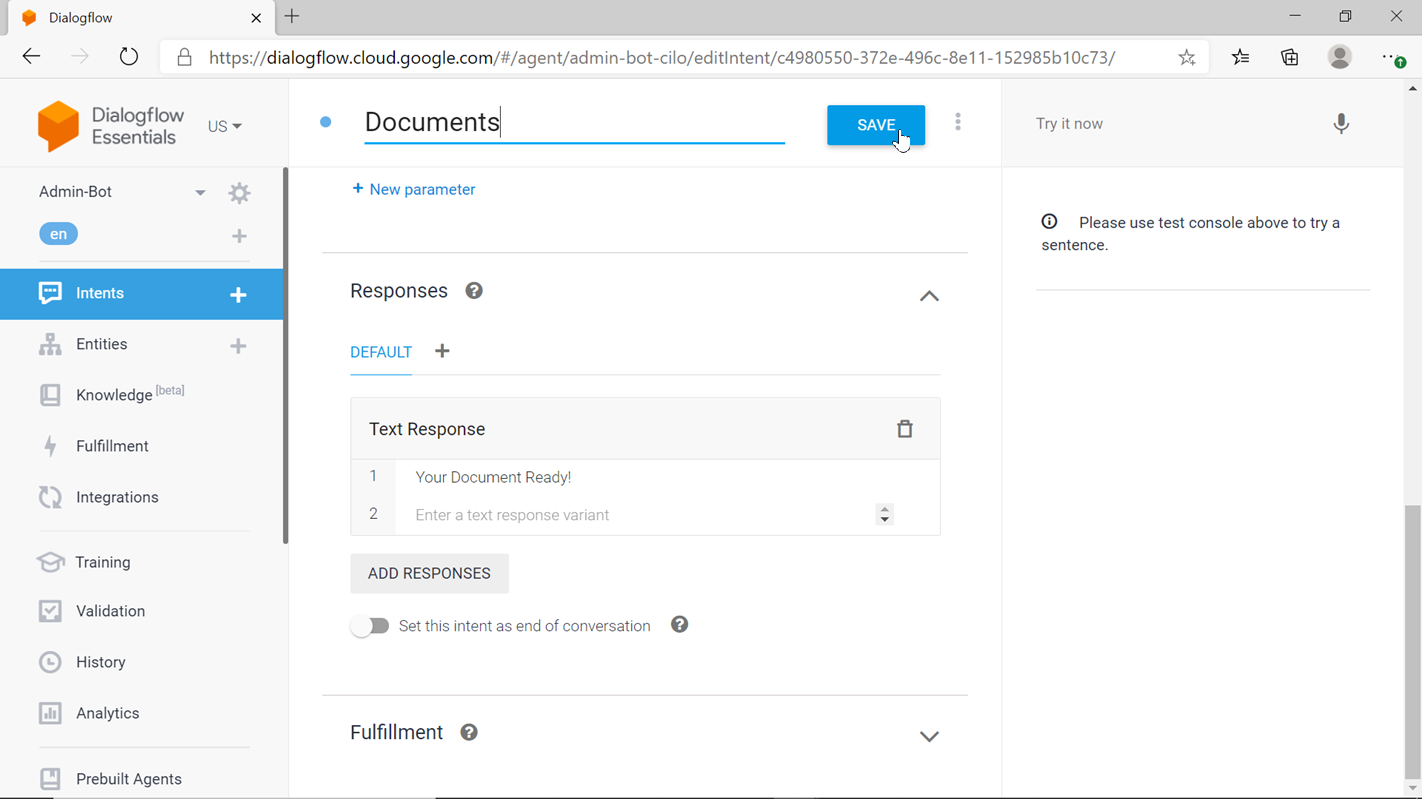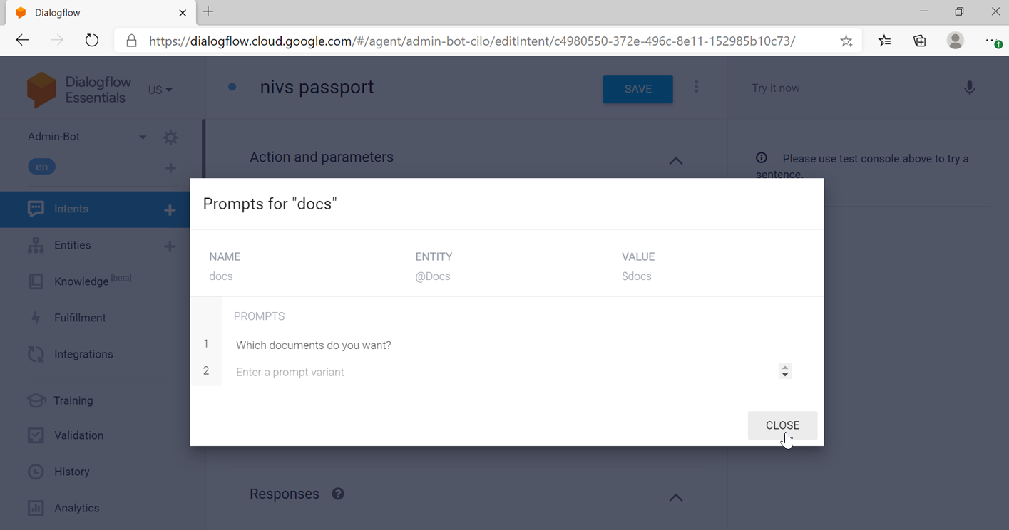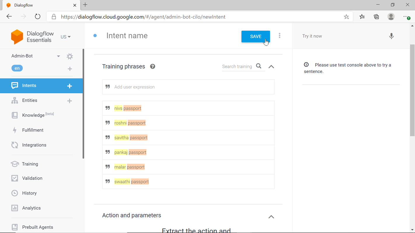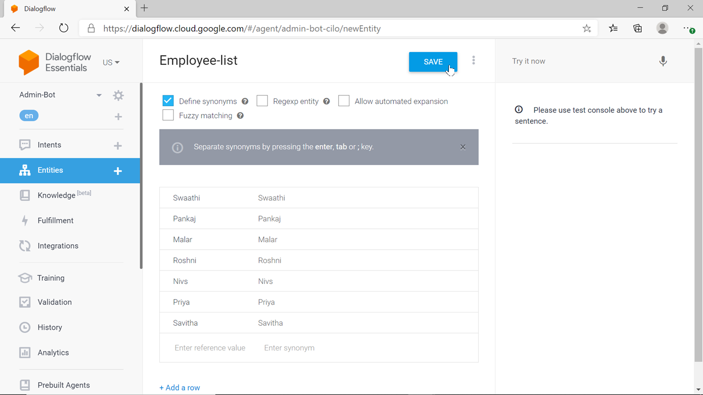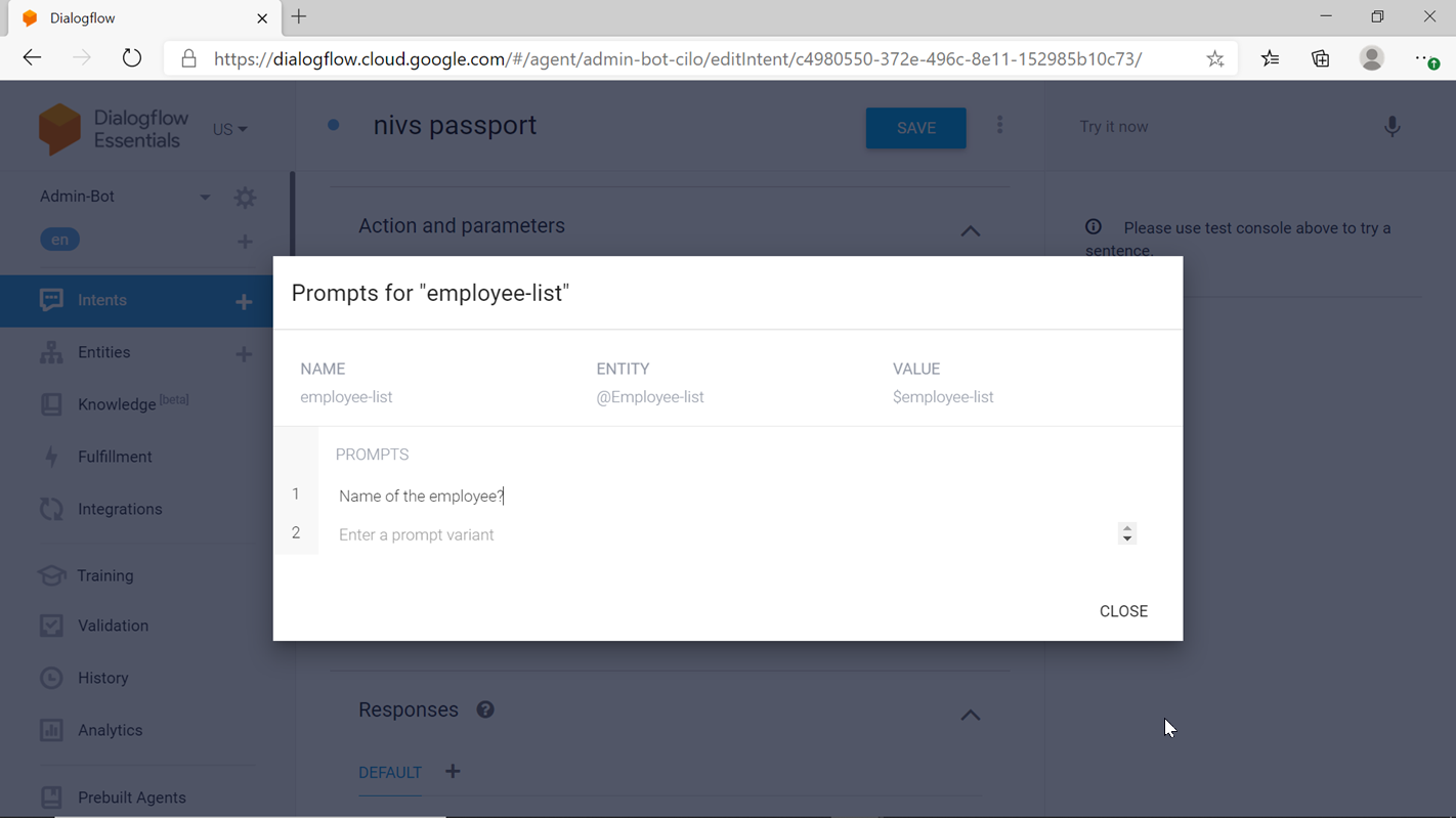 - Create Entities - Here, you can give your input content. For the admin bot, I created an employee list and their documents list.