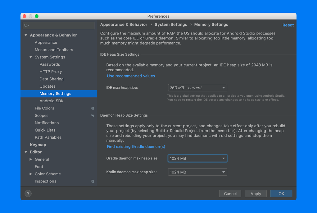 In Android Studio 3.5, the IDE now recognizes the memory when the project needs more RAM on a machine with higher RAM capacity and will notify that you have to increase the memory heap size or you can adjust the memory heap size by yourself under the Appearance & Behaviour → SystemSettings → MemorySettings