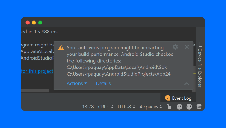For windows users, the default configuration of the antivirus scanner did not optimally exclude the output folders. Android Studio 3.5 detects this and helps you the optimal setup.