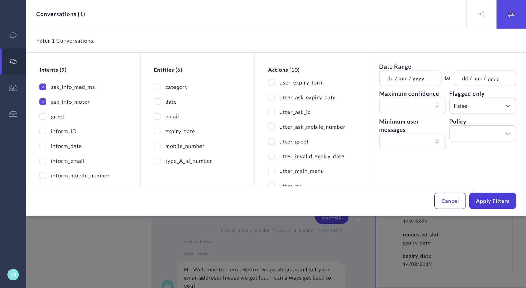 The new conversations tab helps us take a look at previous conversations and even filter based on intents, entities or even confidence value. You just have to click on a message to see how your bot classified the user input into an intent and extracted the entities if any.