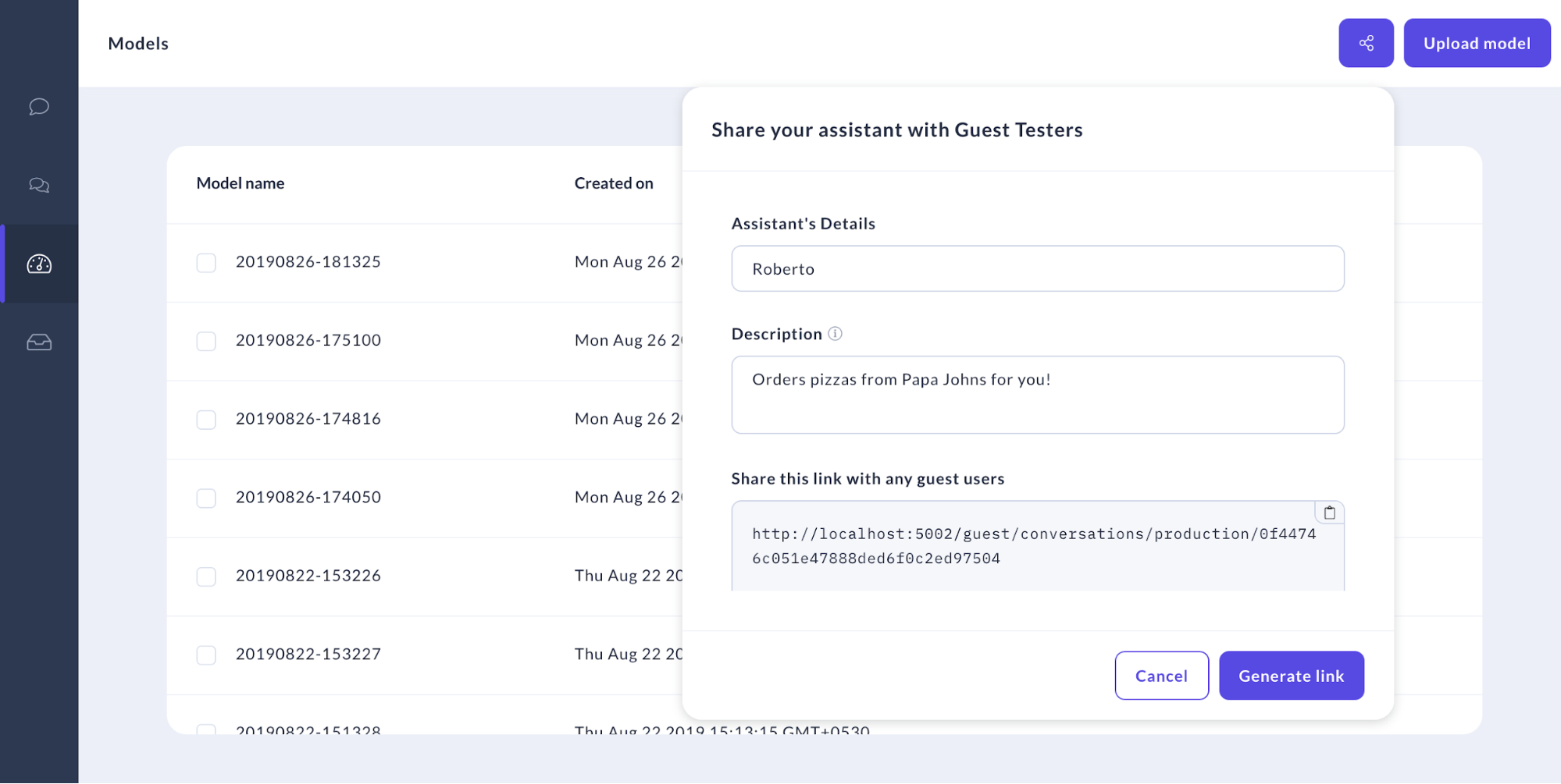 In the models/conversations tab, you can choose to share your bot by generating a link for your assistant for the particular model. By activating a different model and putting it to test, we can even compare the performance of each model by monitoring the bot replies from conversations!
