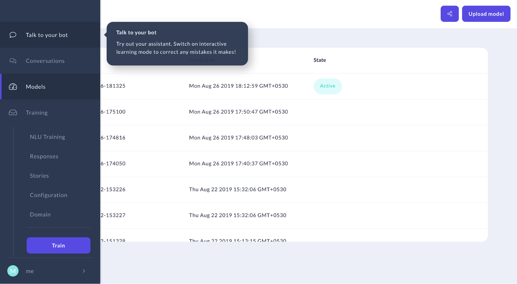 Yup, you read that right. The newest addition to the open-source tools offered by Rasa is the Rasa X which is not a part of the Rasa Stack (It has nothing to do with NLU, CORE or training). It’s all about the UI. The Rasa X UI looks really pretty with the vivid purple color. You can train models with one click of a button, archive models that you do not need, write responses (the utter_actions can be modified here), modify the configuration, update stories on the go as you chat with your bot!